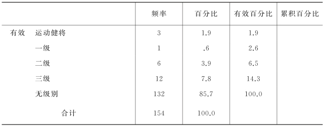 由上表所示,被调查运动员中绝大多数为无运动级别,占被调查运动员的85.7%。
