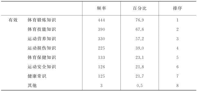 由表4-1-11所示,在体育课堂教学中,绝大多数学生认为教师在课堂主要以传授体育锻炼知识、体育技能知识及运动营养知识,占比分别为76.9%,67.6%和57.2%。而运动损伤知识、体育保健知识及运动安全知识及健康知识占比也都高于两成。说明当前的体育课堂教学早已经不是以前的以传授体育技能知识为主或只是传授运动技能知识的体育课堂了。早已经由原来的以提升竞技能力的体育教育观念,转变为注重体育锻炼、运动营养、运动中的损伤知识及预防,运动医务监督及运动安全的多方面体育知识传授的课堂。这样的体育课堂,既保证了学生体育知识的全面性,也有利于学生对体育教学狭隘性的认识,更保障了学生体育环节参与的正确和健康。学生了解了所学课堂教学项目的技能知识,对运动过程中应当观测的生理指标及个人状态等体育保健学知识及安全注意事项有一定了解,同时具备运动过程中损伤预防、损伤发生的病理、机理及正确的处理方式,也具备了体育锻炼及健康常识。这样的体育知识教学是完备的,是成功的。
