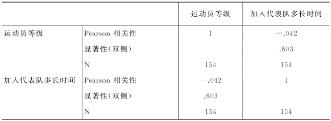 由表4-1-28可知,入队时间的长短还是在一定程度上和运动员等级相关度不明显(P>0.05)。即代表队训练不以运动员的级别作为入队的标准,也不是高校中运动员整个运动训练的主要目的,学生入队时间长短并没有运动员等级的差异性。