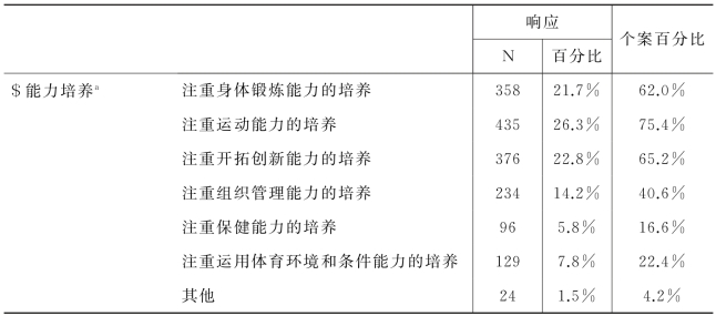 由上表可知,各高校对学生能力培养排在前三位的是运动能力的培养、开拓创新能力的培养及体育锻炼能力的培养。可以看出各高校在能力培养方面注重体育的段利能力,运动技能培养也注意学生的创新能力的培养。