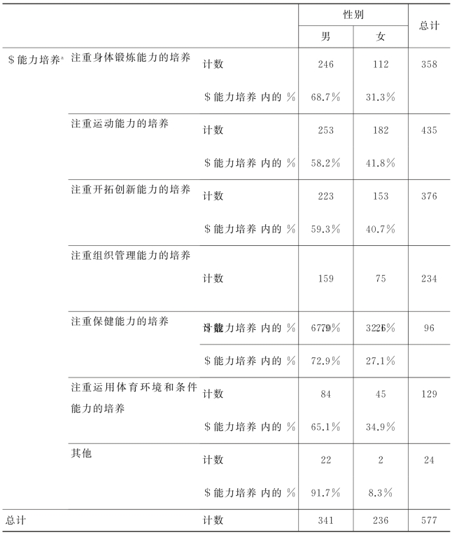 由表4-3-2可知,被调查男学生认为的能力培养前三位为运动技能、身体锻炼能力及开拓创新能力培养;而被调查女学生则认为教师在教学中更加注重的排在前三位的能力培养为运动技能、开拓创新能力及身体锻炼能力三种能力,男女生选择的教师注重的前三类能力是相同的,不同之处在于排列的顺序。对于女生来讲,更多的是体育舞蹈类项目,很多在教学和考核中会有创编的项目,而男生学生的大小球类及其他体能类运动项目则更注重技能的培养。