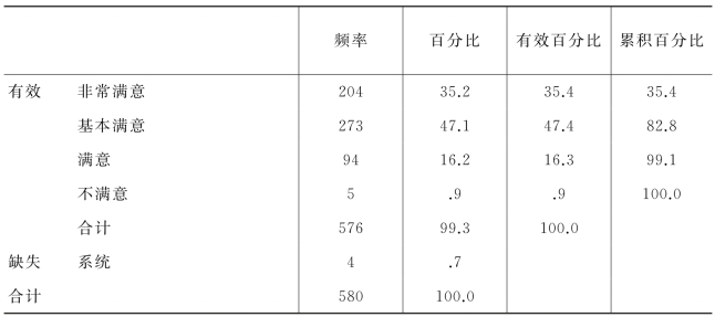 由上表可知,99.1%的被调查学生对当前的体育学习为满意。其中35.4%的学生对自己的收获的满意度为非常满意,47.1%的被调查学生对自己的体育学习收获基本满意。总体来说,学生对当前的体育学习过程还是非常满意的。