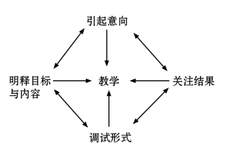 “教学”既然是指教师引起、维持或促进学生学习的所有行为,那么它的逻辑必要条件主要有四个元素:“引起意向——明释目标与内容——调试形式——关注结果”,它是将课堂教学行为引向有效性的最关键途径。引起意向是教学的起点,明释目标内容和调试形式是过程,关注结果是反馈的环节。有效教学的逻辑必要条件模型如图1.1所示。