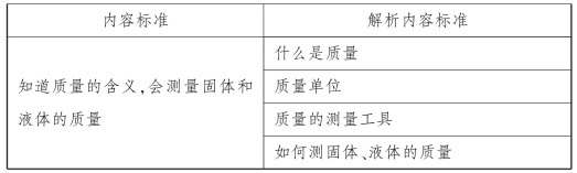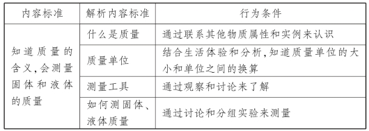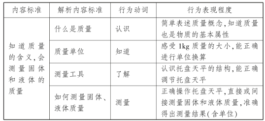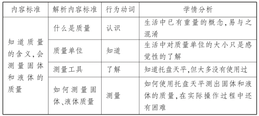 【案例】 以《义务教育物理课程标准(2011年版)》中“物质的属性”内容标准(2)“初步认识质量的概念,会测量固体和液体的质量”为例,说明如何将课程标准分解为学习目标。
