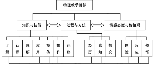针对目前教师在教学目标设计中存在的普遍问题,借鉴现代课程与教学目标取向和我国学者的研究成果,结合《普通高中物理课程标准(实验)》、学科内容特点和学生实际,可以将课程目标的三个纬度——知识与技能、过程与方法、情感态度与价值观,系统地演绎到课堂教学之中,建构高中物理课堂教学目标体系,形成教学目标分类和层次基本框架。如下图2.3所示: