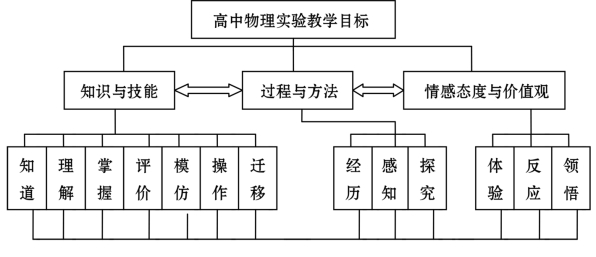 实验是最基本的物理研究方法,培养学生的观察和实验能力是中学物理教学的主要任务之一。实验教学目标对实验教学起着导向、反馈和调节作用,是实验教学的出发点和归宿,也是实验教学测量和评价的基本依据。实验教学目标实际上是物理教育总目标下的一个子目标,但它蕴含的内容比较丰富,任何一个物理实验课题,都包含有三个维度的教学目标,即知识与技能、过程与方法、情感态度与价值观目标,构成三维立体结构,是一个有机的整体。目标结构如图2.4所示。