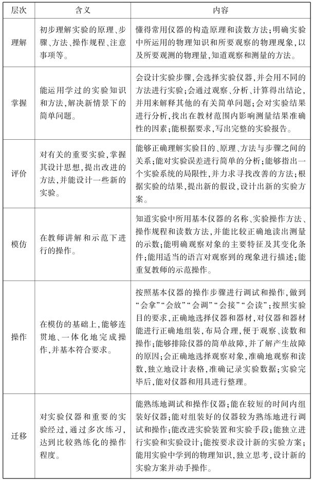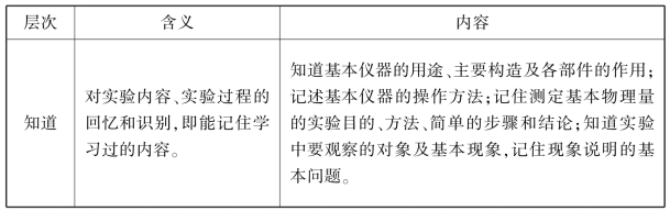 有关实验原理、方法、步骤,实验仪器的工作原理、读数方法、误差分析和实验设计等内容属于知识领域,这一领域的目标又可以分为四个层次:知道、理解、掌握、评价。有关仪器的使用、实验过程中的观察与操作都属于技能领域,这一领域的目标又可以分为三个层次:模仿、操作、迁移。其内容详见表一所示。