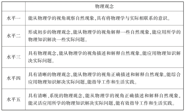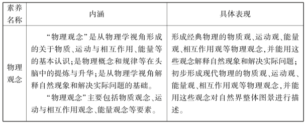 “物理观念”是从物理学视角形成的关于物质、运动与相互作用、能量等的基本认识,是物理概念和规律等在头脑中的提炼与升华,是从物理学视角解释自然现象和解决实际问题的基础。“物理观念”主要包括物质观念、运动与相互作用观念、能量观念等要素。