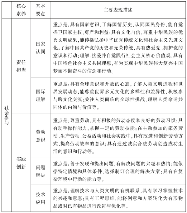 ①责任担当。主要是学生在处理与社会、国家、国际等关系方面所形成的情感态度、价值取向和行为方式。具体包括社会责任、国家认同、国际理解等基本要点。