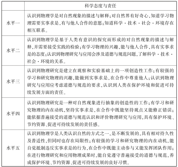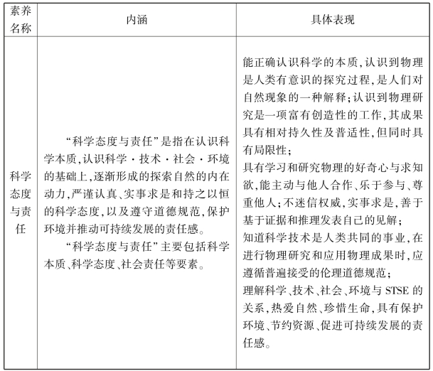 “科学态度与责任”是指在认识科学本质,认识科学·技术·社会·环境(STSE)关系的基础上,逐渐形成的探索自然的内在动力,严谨认真、实事求是和持之以恒的科学态度,以及遵守道德规范,保护环境并推动可持续发展的责任感。“科学态度与责任”主要包括科学本质、科学态度、社会责任等要素。
