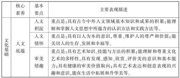 ①人文底蕴。主要是学生在学习、理解、运用人文领域知识和技能等方面所形成的基本能力、情感态度和价值取向。具体包括人文积淀、人文情怀和审美情趣等基本要点。
