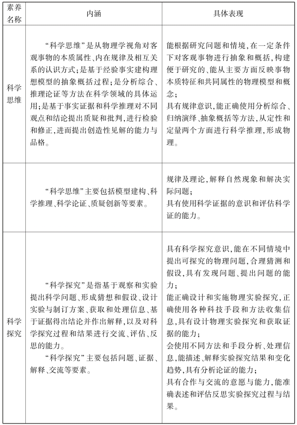 “科学思维”是从物理学视角对客观事物的本质属性、内在规律及相互关系的认识方式;是基于经验事实建构理想模型的抽象概括过程;是分析综合、推理论证等方法在科学领域的具体运用;是基于事实证据和科学推理对不同观点和结论提出质疑和批判,进行检验和修正,进而提出创造性见解的能力与品格。“科学思维”主要包括模型建构、科学推理、科学论证、质疑创新等要素。