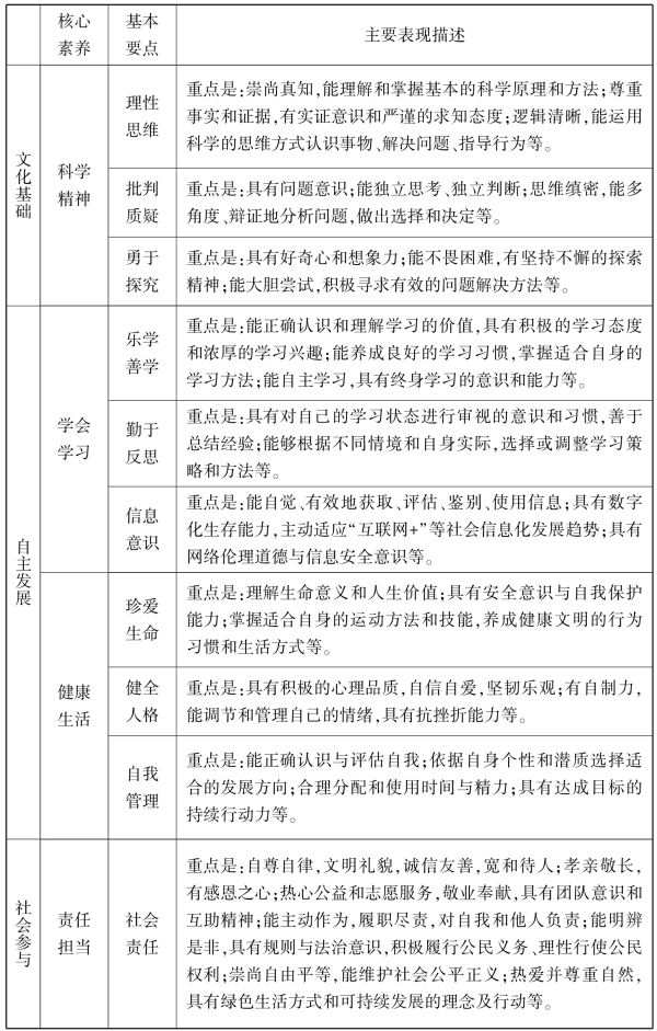 综合表现为人文底蕴、科学精神、学会学习、健康生活、责任担当、实践创新六大素养,具体细化为国家认同等十八个基本要点。根据这一总体框架,可针对学生年龄特点进一步提出各学段学生的具体表现要求。