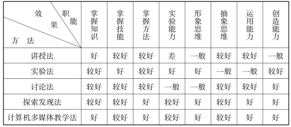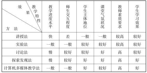 教学方法多种多样,每一种方法都有自己的特点,各有其适用条件和适用范围,也就是说,每种方法都有自己的长处和各自的局限性。把某一种方法说成是放之四海而皆准的最佳方法,过分地强调其作用,或把某一种方法说得一无是处,过分地贬低其作用,都是不正确的。下表1是各种教学方法在培养学生各种能力方面的比较,表2是各种教学方法的教学特性比较: