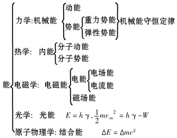 二是用网络归类法,即把同类知识进行归纳整理,从而便于比较和记忆。例如在高中物理总复习阶段的归类复习时,针对能量这一主题,教师要引导学生把所学过的几种类型的能进行归纳整理如下: