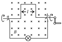 【例】 将硬导线中间一段折成不封闭的正方形,每边长为l,它在磁感应强度为B、方向如图6.12的匀强磁场中匀速转动,转速为n,导线在a、b两处通过电刷与外电路连接,外电路有额定功率为P的小灯泡并正常发光,电路中除灯泡外,其余部分的电阻不计,灯泡的电阻应为
