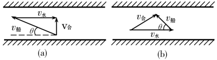 (11)船渡河时,船头总是直指对岸所用的时间最短;当船在静水中的速v船>v水时,船头斜指向上游,且与岸成θ角时,cosθ=v水/v船时位移最短;当船在静水中的速度v船<v水时,船头斜指向下游,且与岸成角θ,cosθ=v船/v水。如图6.19中的(a)、(b)所示。