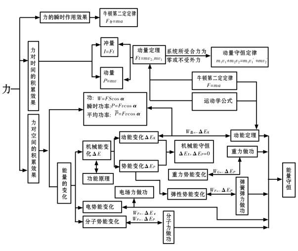 由于知识的本质联系方式是多种多样的,所以可从不同角度,多层次地把知识系统化。知识系统化的关键是要切实打好基础,即以扎扎实实掌握的概念为点,以熟练掌握的物理规律为线,编织成的知识网才有实际意义。学生掌握了总结归纳法,就可把知识“结网”,绘制主线明确、思路流畅、安排巧妙、横向跨度大、纵向联系深的知识结构网络图。如对于动力学的三大基本观点,总结归纳如下: