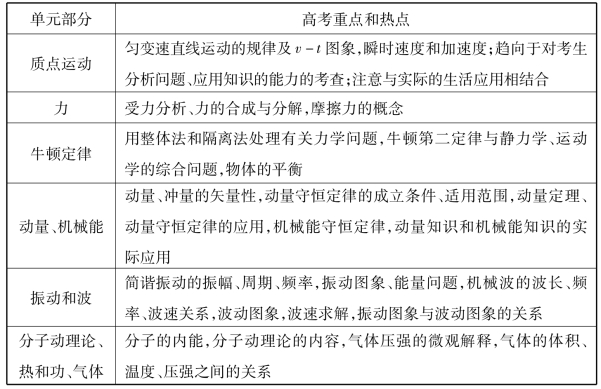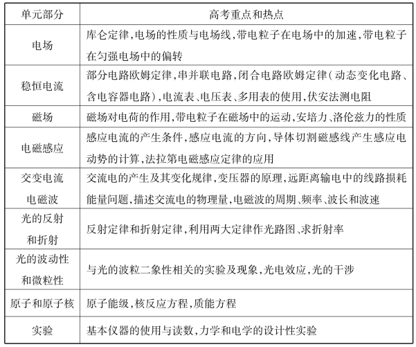 总复习必须明确方向,要把课程标准和物理考纲中所规定的高考物理的主干核心知识点与命题热点梳理清楚,对每一模块、单元进行复习时,要抓住主干核心知识,发挥以点带面的作用,才能提高复习的效率。如下表所示,为高考物理的重点和命题热点,复习时可供参考。