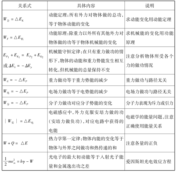俄国著名心理学家谢切诺夫说:“比较是人的最珍贵的智力宝藏。”列表比较法是开发智力宝藏的好方法。它有助于学生对物理概念、规律的理解、记忆,有助于知识的迁移和思维能力的培养。教师要做好示范,并指导学生在运用此法时要特别注意,对相似概念或规律,要找出它们的本质区别;对差异很大的概念或规律,要找出它们的相同点。例如,对功和能关系在物理各部分中的应用列表比较如下: