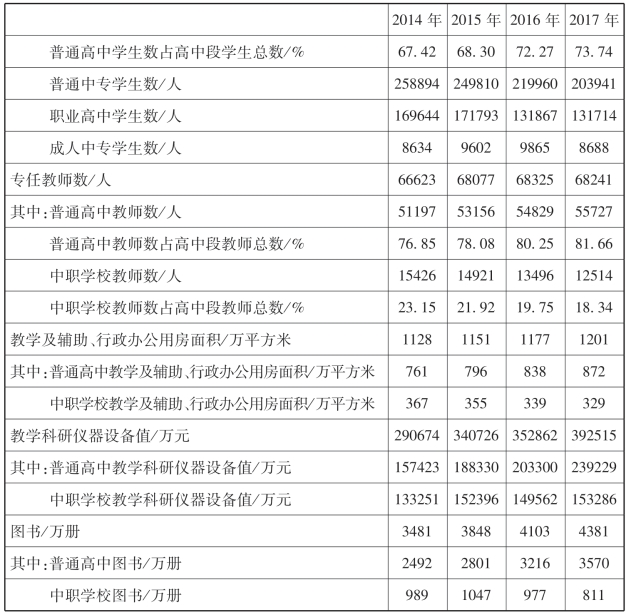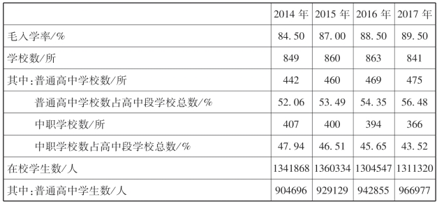 2017年,我省高中阶段的毛入学率为89.50%,比2016年的88.50%提高了1百分点。我省高中阶段学校数为841所,比2016年的863所减少了22所。其中普通高中为475所,比2016年的469所增加了6所;中职学校366所,比2016年的394所减少了28所。我省高中阶段学生数为1311320人,比2016年的1304547人增加了6773人。其中普通高中学生数为966977人,比2016年的942855人增加了24122人,普通高中学生数占高中段学生总数的73.74%,比2016年的72.27%提高了1.47百分点;中职学校学生数为344343人,比2016年的361692人减少了17349人,中职学校学生数占高中段学生总数的26.26%,比2016年的27.73%降低了1.47百分点。从近四年的数据对比中得知:高中阶段教育普及程度有所提高,在高中阶段读书的人数与比例都有所增加。但要注意,普通高中的学校数、学生数逐年在增加,而中职学校的学校数、学生数及学生数所占高中阶段学生总数的比例呈现逐年减少的趋势,中职教育规模不足成了我省普及高中阶段教育的短板。