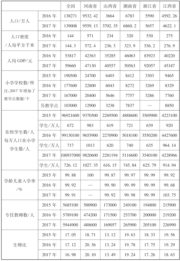 表1.1.7 全国及相关省份小学教育发展基本情况表