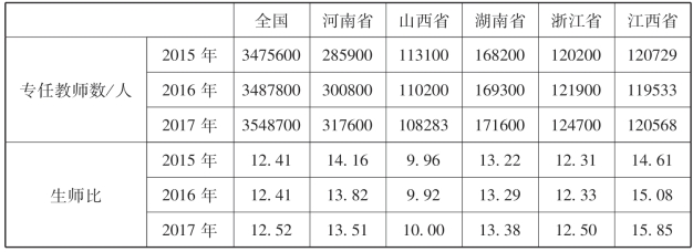 表1.1.8显示,我省每万人口中有413.32名初中学生,与全国每万人口中的319.55名初中生相比多了93.77名。人均GDP并没优势的江西与河南两省的初中学生在总人口中所占比例是较大的,无论是当今乃至以后,这两省的教育压力都是较大的。再看生师比,我省2015年、2016年、2017年的生师比分别是14.61∶1、15.08∶1、15.85∶1,与表中列举的四个省份三年数据相比均是最高的;与全国2015年、2016年、2017年的平均数12.41∶1、12.41∶1、12.52∶1相比分别高了2.2、2.67、3.33,这说明我省初中教师的工作量是最大的,如果与表中所列的山西省相比,压力更大。这说明了我省初中教育发展还不充分、不平衡,办学条件仍然比较落后,教师数量严重不足,教师职业吸引力下降,依法治教还任重道远。
