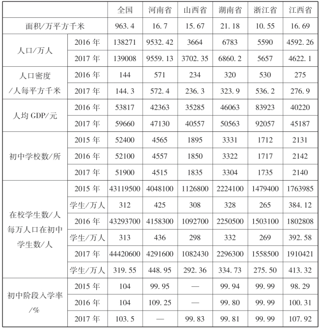 表1.1.8 全国及相关省份的初中教育发展基本情况表