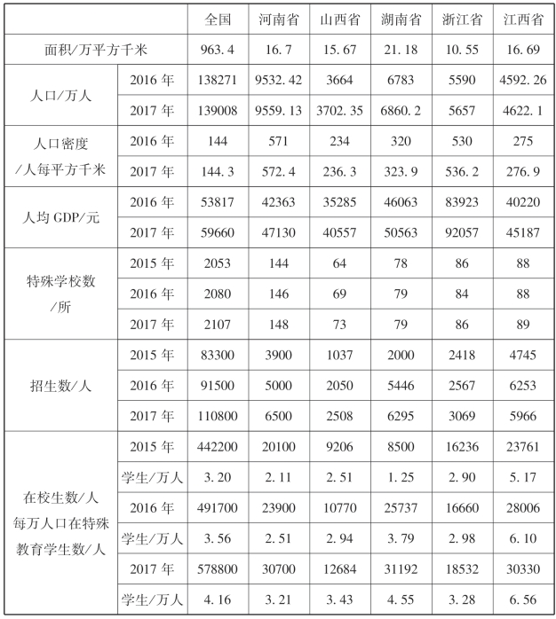 一是特殊教育学校分布不均、入学率不高。按照省残疾人联合会公布,根据第二次全国残疾人抽样调查,我省现有残疾人约283万人,其中,视力残疾人46.6万人、听力残疾人63.8万人、言语残疾人4.8万人、肢体残疾人85.2万人、智力残疾人25万人、精神残疾人19.6万人、多重残疾人38万人。从总体上看,残疾人的数量增加、结构变化,社会发展中的伤残风险增大,这是一个人数众多、涉及面广的特殊群体。我省残疾儿童有80%生长在交通不便、经济落后的山区地域,但是特殊学校一般都集中在一些30万人以上的县或县以上的城市地区,并且数量不多,规模不大。表1.1.5与表1.1.10显示,我省2014年、2015年、2016年、2017年的在校残疾儿童分别为19765人、23761人、28006人、30330人,不在特殊学校而是在当地学校随班就读的分别占在校残疾儿童总数的68.19%、70.54%、71.98%、69.95%,真正在特殊学校就读的残疾儿童2014年、2015年、2016年、2017年分别是6287人、7000人、7848人、9115人。数据表明,虽然我省经过极大努力,但还有不少残疾儿童还是难于进入专业水准较高的特殊教育学校就读。