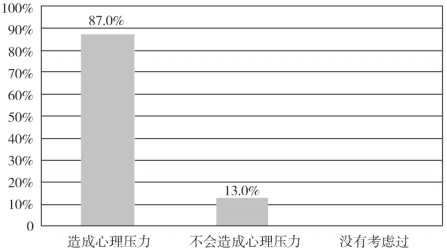 在对分层走班教学会给教师带来哪些影响的调查中,高达88.9%的教师认为会增加工作量(见图2.4.1),却不能认识到分层走班教学后,学生的学科学业水平更趋于一致,学情相对更简单,可以让自己的教学更有针对性,更有利于提高教学效率。同样有高达87.0%的教师认为会造成心理压力(见图2.4.2),实际上就是怕自己被安排担任低层次班级的教学而没有面子;如果放开来由学生自主选择教师,尤其担心不能被学生选择的尴尬,却不能认识到这将是一种必然趋势,而且直面学生的选择,也有利于促进自己的专业成长。