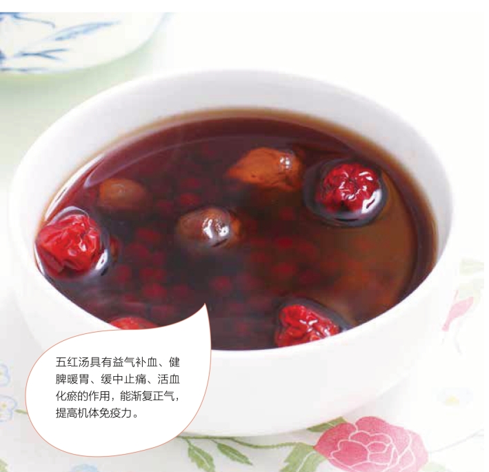 材料 红枣10克,红皮花生10克,红豆20克,山楂5克,红糖3~5克。