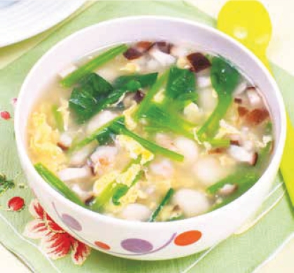 材料 面粉50 克,鲜香菇30 克,鸡蛋1个,虾仁、菠菜各20 克。