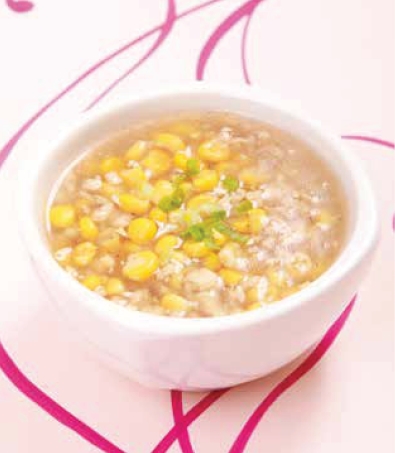 材料 玉米粒50克,鸡胸肉30克,豌豆20克。