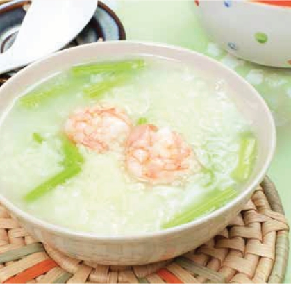 功效 粥里加入虾仁和西芹,可以补钙、预防产后便秘。