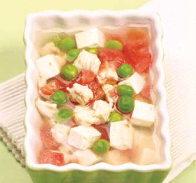 材料 豆腐200克,鸡胸肉、番茄、鲜豌豆各50克。