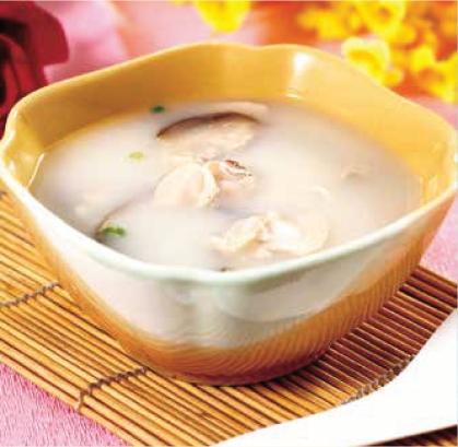 2 锅内加入清汤、料酒、盐,烧沸后放入青豌豆、牡蛎肉、香菇片、冬笋片、姜末,烧沸,淋入香油即可。