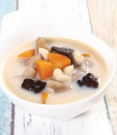 2 锅置火上,倒植物油烧至六成热,放入香菇块煸香,放入胡萝卜块煸炒片刻,倒入高汤,大火煮沸后放入藕块、花生米,小火煲1小时,加入盐调味即可。