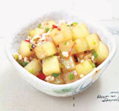 2 锅内倒油烧热,放入冬瓜煎香,放香菇粒、青红椒粒炒香。