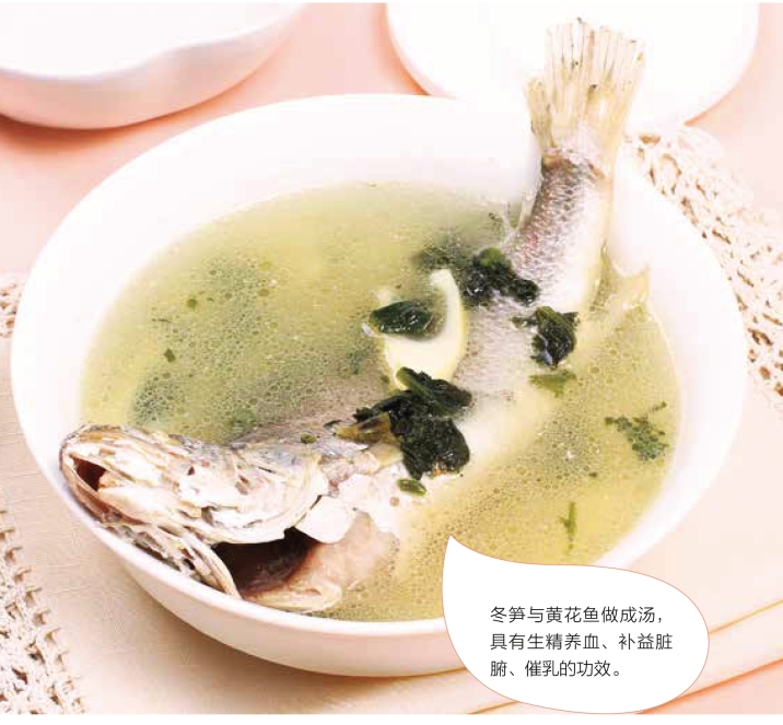 2 锅内倒油烧热,将黄花鱼两面各煎片刻,加清水,放冬笋片、雪菜碎、葱段、姜片大火烧开,转中火煮15分钟,加盐调味,拣去葱段、姜片,撒上白胡椒粉即可。