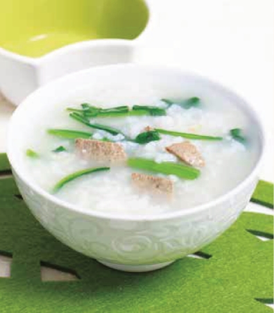 3 煮至粥将成时,将猪肝片放入锅中煮熟,再加菠菜段稍煮,加盐调味即可。