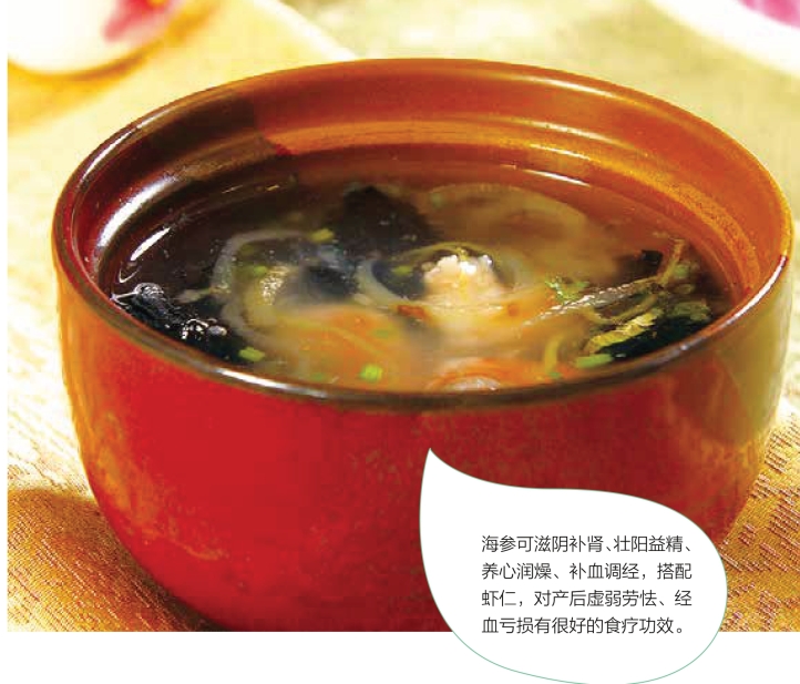 2 汤锅置火上,倒油烧至七成热,炒香葱花、姜丝,倒入木耳朵、海参丝和鲜虾仁翻炒均匀,加适量清水大火烧沸,转小火煮5分钟,加盐调味,用水淀粉勾芡即可。