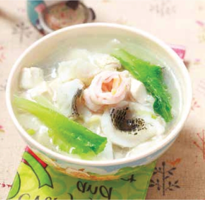 材料 鲜虾仁100克,鱼肉50克,嫩豆腐200克,青菜心30克。
