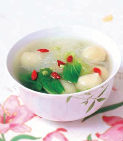 材料 鱼丸150克,小油菜、粉丝各50克,枸杞子10克。