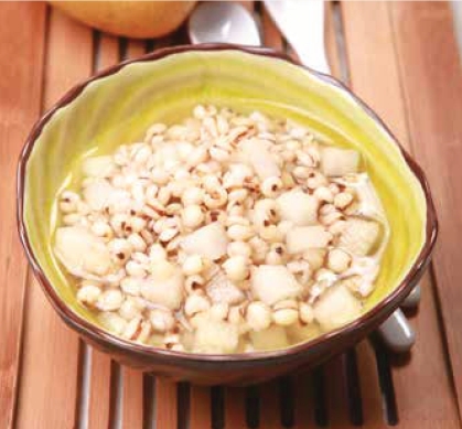 功效 薏米富含维生素E,常食可使皮肤细腻、有光泽,改善肤色;雪梨可滋阴润燥。产后的新妈妈食用,有助于美白肌肤、滋阴润燥。