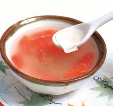 2 锅中倒入清水,放入芦荟片和西瓜块,加入冰糖,大火烧开,用水淀粉勾芡即可。