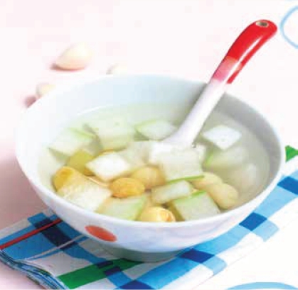 功效 冬瓜可清热解暑、润肤美白,莲子可滋阴补虚、强心安神,二者与白果搭配,有助于滋阴养颜抗衰老,使人肌肤、面部红润。
