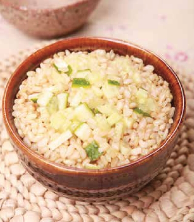 功效 糙米中含B族维生素和维生素E,能提高人体免疫功能,促进血液循环;黄瓜中的黄瓜酶有很强的生物活性,能有效地促进机体的新陈代谢。
