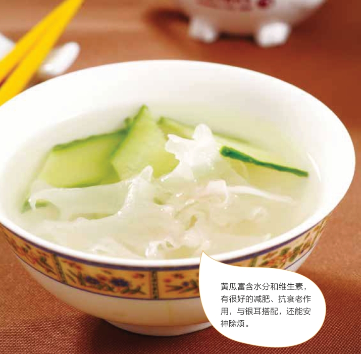 2 锅置火上,加适量清水中火煮沸,放入银耳、黄瓜片、葱花煮5分钟,用盐和香油调味即可。