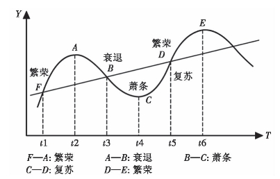 经济周期(Business cycle),也称商业周期,它是指经济运行中周期性出现的经济扩张与经济紧缩交替更迭、循环往复的一种现象,反映了国民总产出、总收入和总就业的波动。首先上升阶段即繁荣,最高点称为顶峰,顶峰也是经济由盛转衰的转折点,此后经济就进入下降阶段,即衰退。衰退严重则经济进入萧条,衰退的最低点称为谷底,谷底也是经济由衰转盛的一个转折点,此后经济进入上升阶段。经济从一个顶峰到另一个顶峰,或者从一个谷底到另一个谷底,就是一次完整的经济周期。一般将经济周期分为四个阶段:繁荣、衰退、萧条、复苏。如图2-1表示。