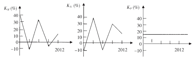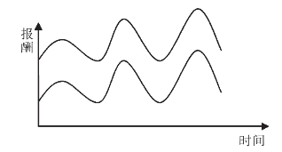 “相关”是数列之间相关性的统计计量。如果两个数列的变动沿着相同方向进行,表明它们之间是“正相关”;如果两个数列的变动沿着相反的方向进行,表明它们是“负相关”。相关程度高低用相关系数r来计量,其值位于+1和-1之间。r>0,表明它们之间正相关,r=+1,为完全正相关;反之,r<0,表明它们之间负相关,r=-1,为完全负相关。两个数列完全正相关、完全负相关的变动如图3-11和图3-12所示。